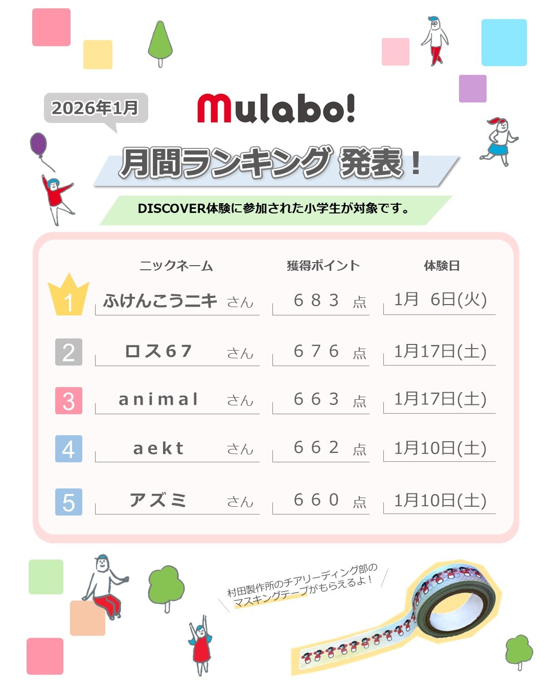 1月の「月間ランキングトップ5」を発表! 1/6(火)~31(土)にDISCOVER体験された小学生のうち、こちらトップ5のみなさまには4/30(木)まで、ご来館の際にノベルティをプレゼントいたします。