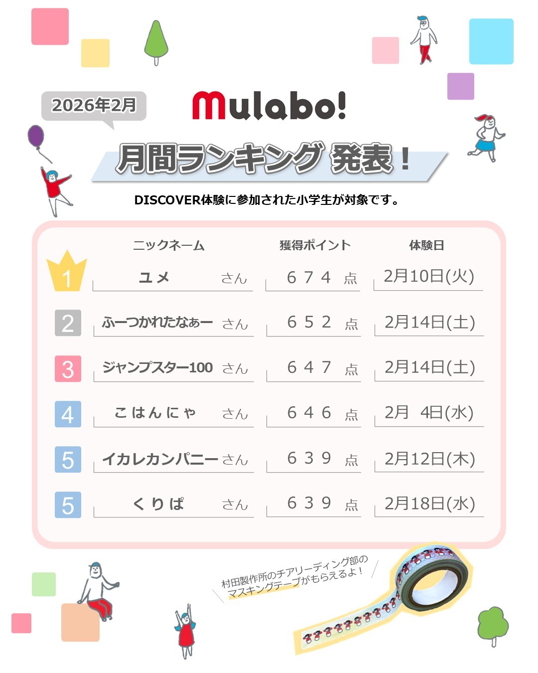 2月の「月間ランキングトップ5」を発表! 2/3(火)~28(土)にDISCOVER体験された小学生のうち、こちらトップ5のみなさまには5/29(金)まで、ご来館の際にノベルティをプレゼントいたします。