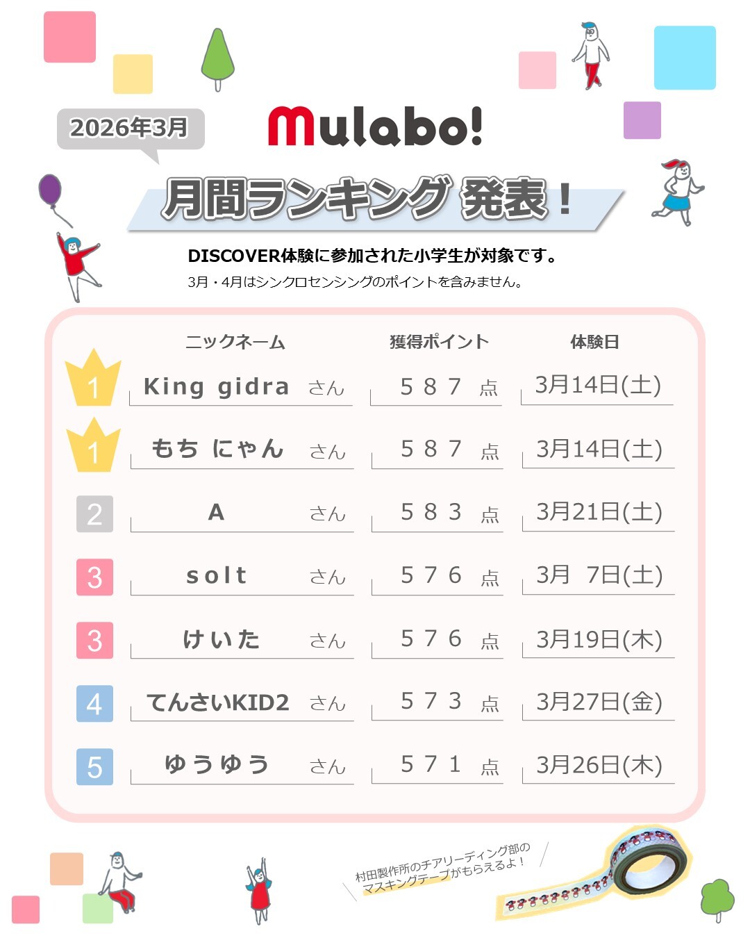 3月の「月間ランキングトップ5」を発表! 3/2(火)~31(火)にDISCOVER体験された小学生のうち、こちらトップ5のみなさまには6/30(火)まで、ご来館の際にノベルティをプレゼントいたします。(シンクロセンシングのスコアを含めません)