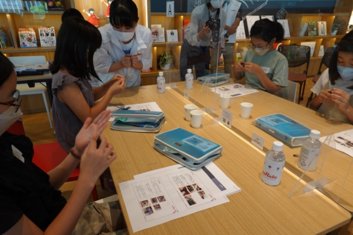 ムラタの社員がサポーターとして各グループの指導や補助にあたります。作成した「スイスイUFO」はお持ち帰りいただけます。