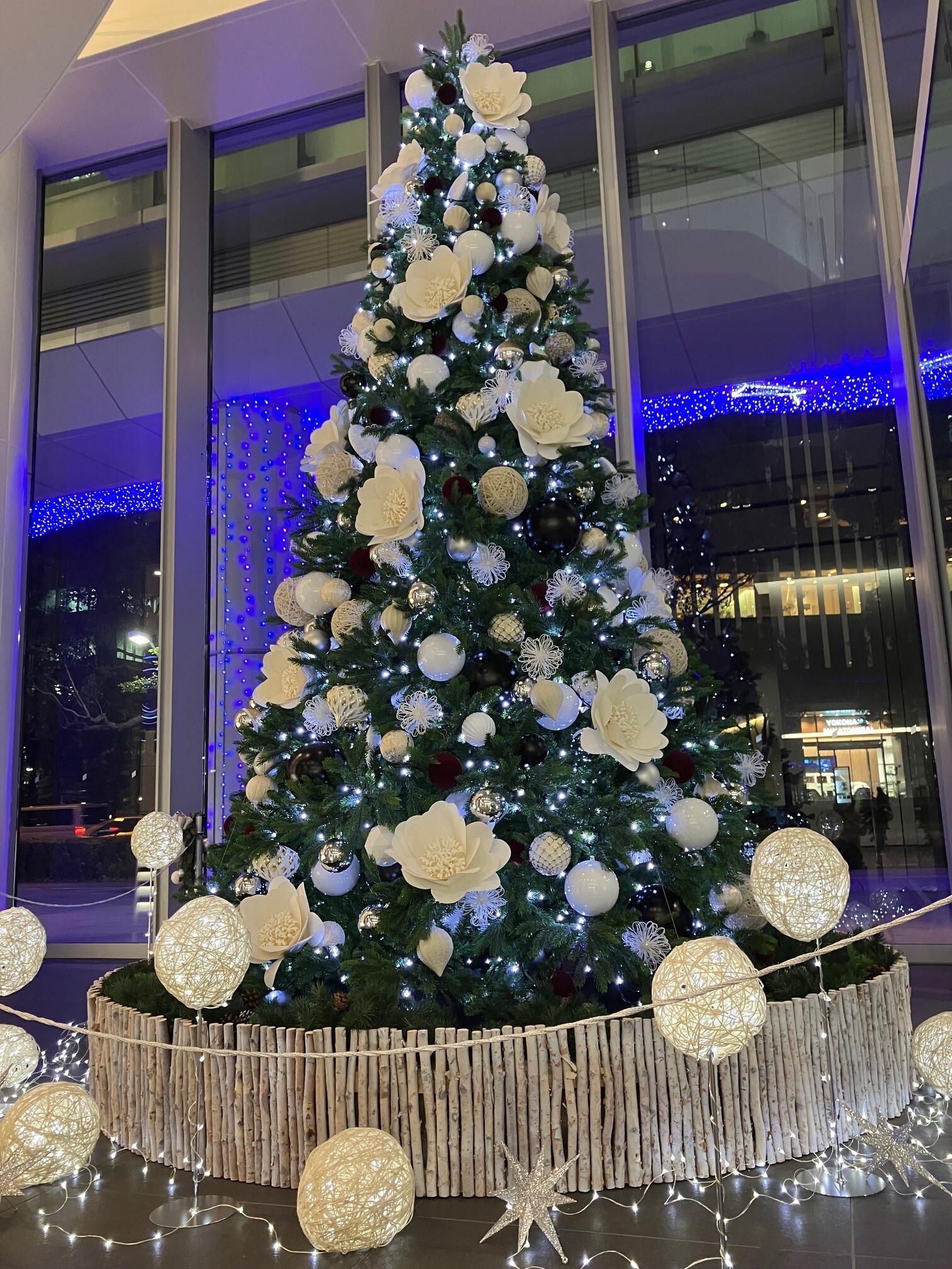 1F玄関に設置したクリスマスツリーの装飾に使われているランプシェードは村田製作所の若手従業員たちが想いを込めて制作しました。